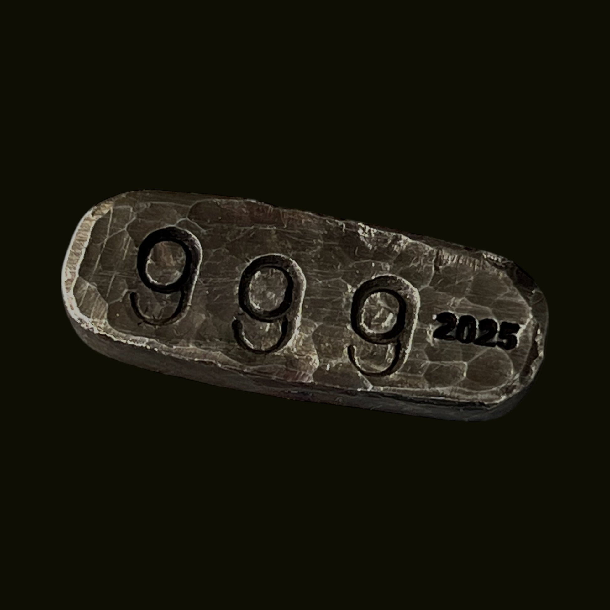This Minimalist Silver Bar is made of pure .999 Silver and measures approximately 1-1/8" in length. Each piece is hand-poured, hammered, and stamped in our small family workshop. Awesome as a gift or a unique addition to your silver collection.